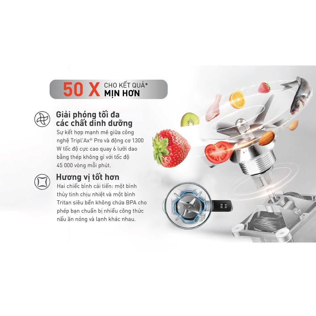 Máy xay sinh tố Tefal BL985A31 - 1300W được trang bị công suất 1300w mạnh mẽ, cộng với tốc độ xay 45.000 vòng/phút giúp hạt được xay ra với chất lượng cao, giữ lại được chất dinh dưỡng có trong hạt, với hương vị thơm ngon và đậm đặc.