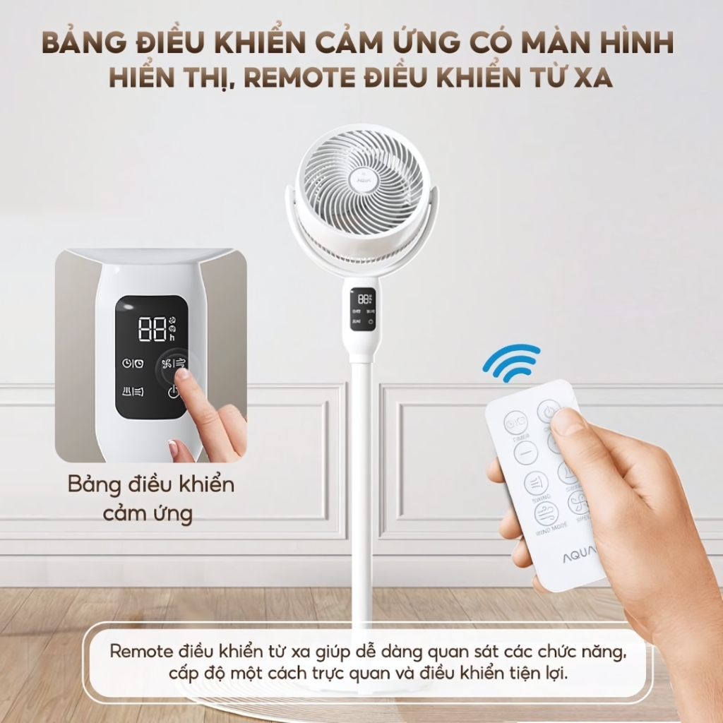 - Điều khiển cảm ứng hiện đại: Bảng điều khiển cảm ứng với màn hình LED hiển thị rõ ràng, tích hợp remote điều khiển từ xa tiện lợi, cho phép tùy chỉnh 3 cấp độ gió (nhẹ, trung bình, mạnh) mà không cần di chuyển.