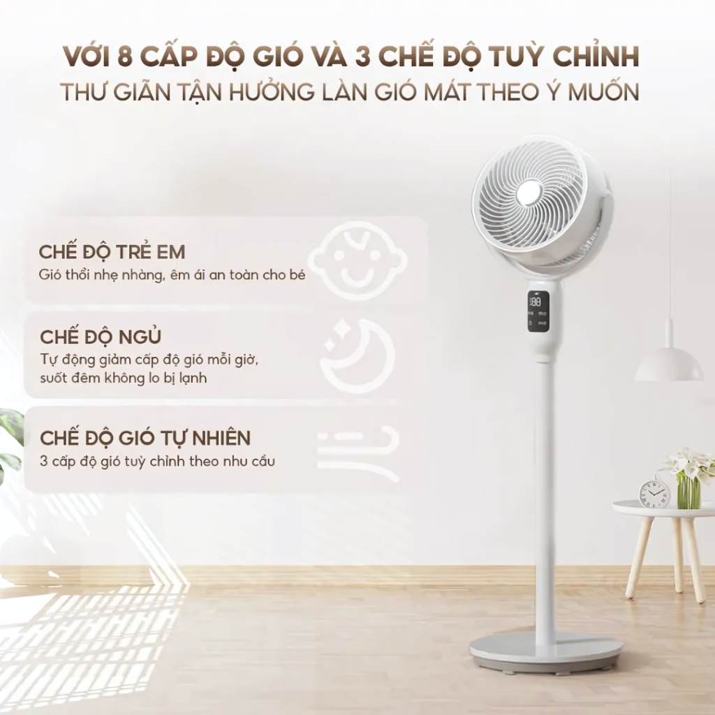 - Chế độ hẹn giờ và điều khiển từ xa mang lại sự tiện nghi tối đa, giúp bạn dễ dàng điều chỉnh luồng gió theo nhu cầu mà không cần thao tác trực tiếp. Độ ồn thấp cùng khả năng duy trì độ ẩm tự nhiên giúp bảo vệ sức khỏe, tránh khô da, đặc biệt phù hợp cho gia đình có trẻ nhỏ hoặc người lớn tuổi. Sản phẩm lý tưởng cho không gian sống hiện đại, mang lại sự thoải mái và thư giãn trong mọi thời tiết