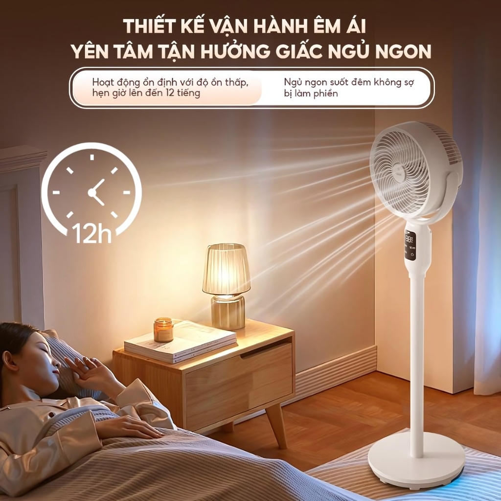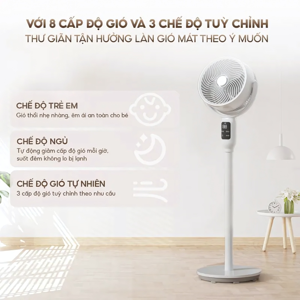 - Chế độ hẹn giờ và điều khiển từ xa mang lại sự tiện nghi tối đa, giúp bạn dễ dàng điều chỉnh luồng gió theo nhu cầu mà không cần thao tác trực tiếp. Độ ồn thấp cùng khả năng duy trì độ ẩm tự nhiên giúp bảo vệ sức khỏe, tránh khô da, đặc biệt phù hợp cho gia đình có trẻ nhỏ hoặc người lớn tuổi. Sản phẩm lý tưởng cho không gian sống hiện đại, mang lại sự thoải mái và thư giãn trong mọi thời tiết.