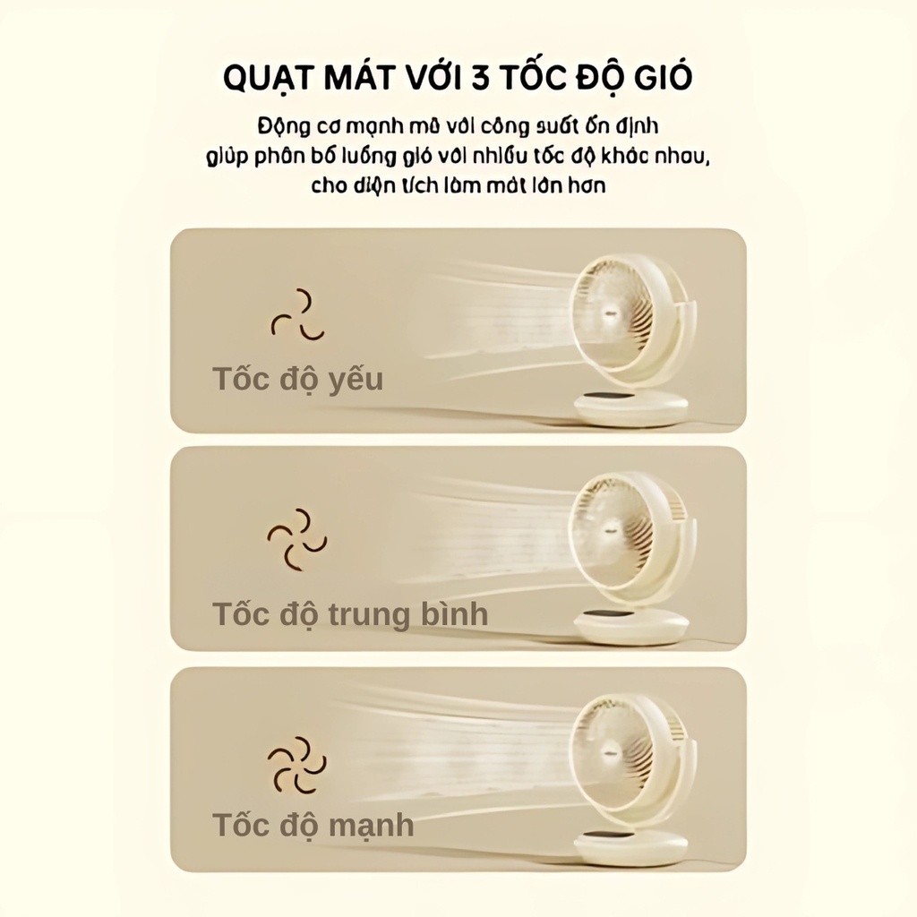 Được trang bị 3 tốc độ gió linh hoạt: nhẹ nhàng, trung bình và mạnh mẽ. Bạn có thể dễ dàng điều chỉnh tốc độ gió phù hợp với nhu cầu của mình, từ làn gió dịu mát để thư giãn đến luồng gió mạnh mẽ để làm mát nhanh chóng. Động cơ mạnh mẽ của quạt đứng lưu thông không khí AQS-FED2001R(W)-VN kết hợp với thiết kế cánh quạt tối ưu, phân phối luồng gió đều khắp căn phòng, mang đến không gian mát lạnh chỉ trong nháy mắt.