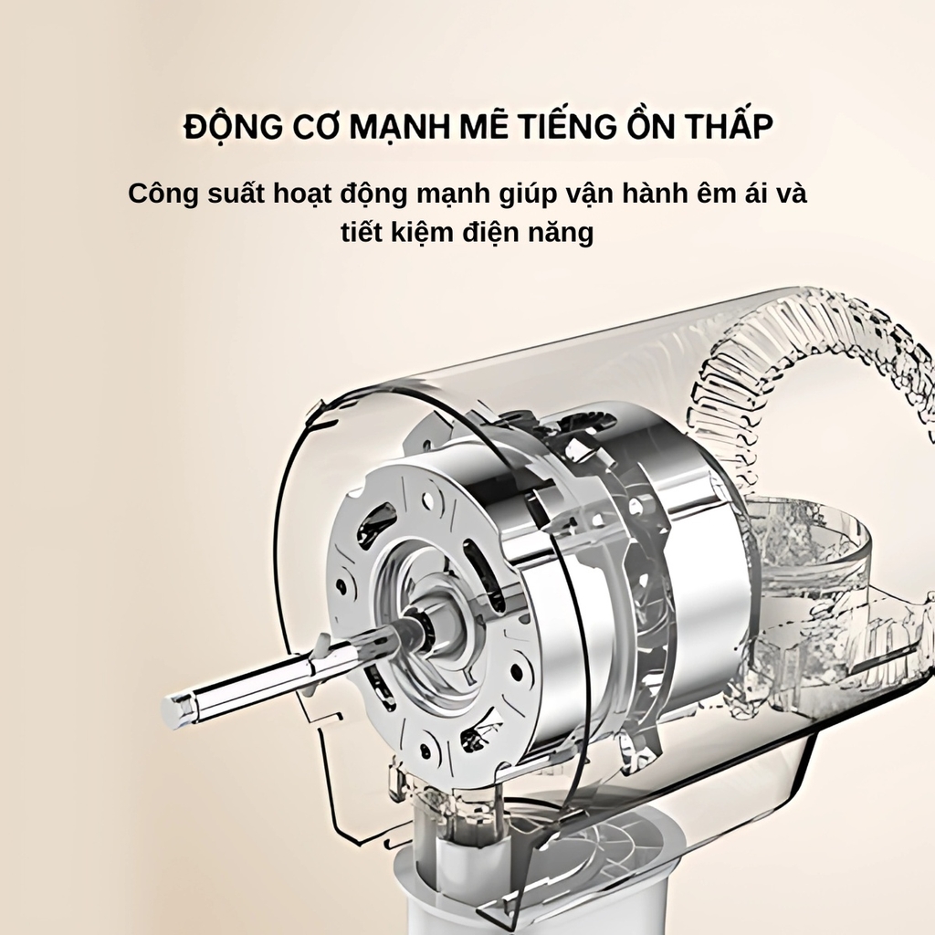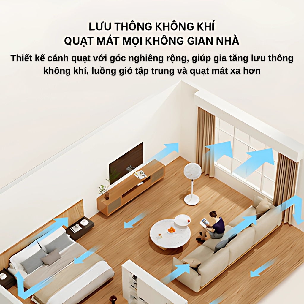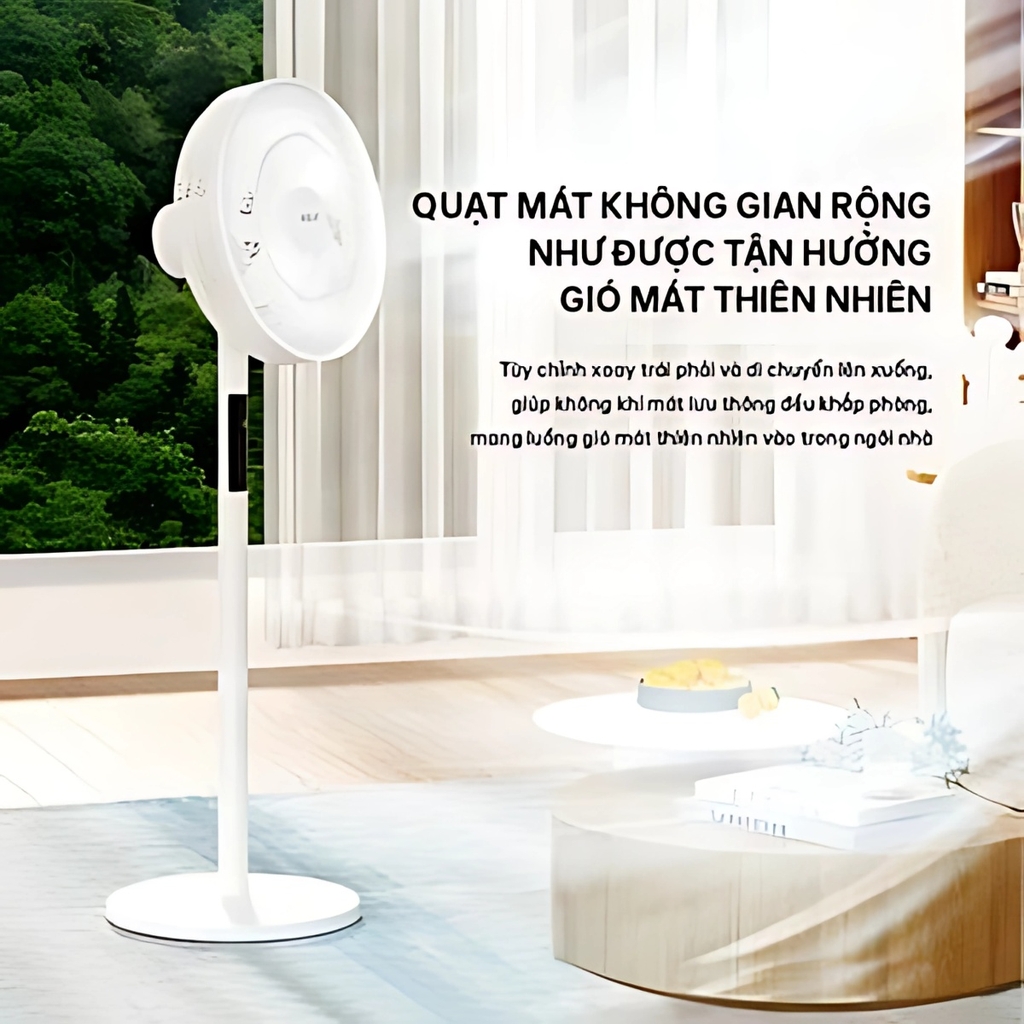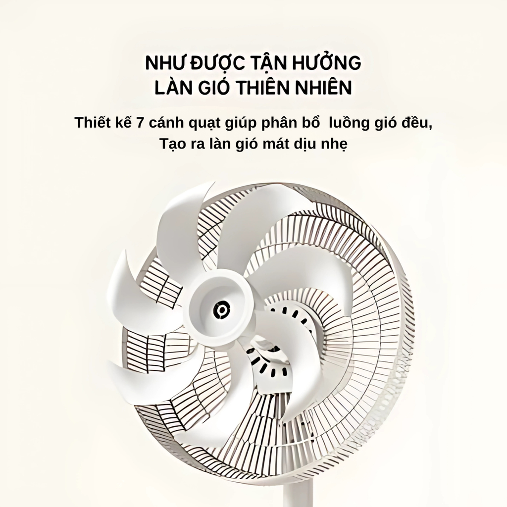 Với thiết kế 7 cánh quạt đường kính 35cm cùng công suất mạnh mẽ 50W, quạt mang lại khả năng làm mát nhanh chóng và hiệu quả, đồng thời tiết kiệm điện năng. Động cơ không chổi than vận hành êm ái và ổn định với độ ồn thấp chỉ 65dB, thích hợp sử dụng tại những không gian yêu cầu độ yên tĩnh cao.