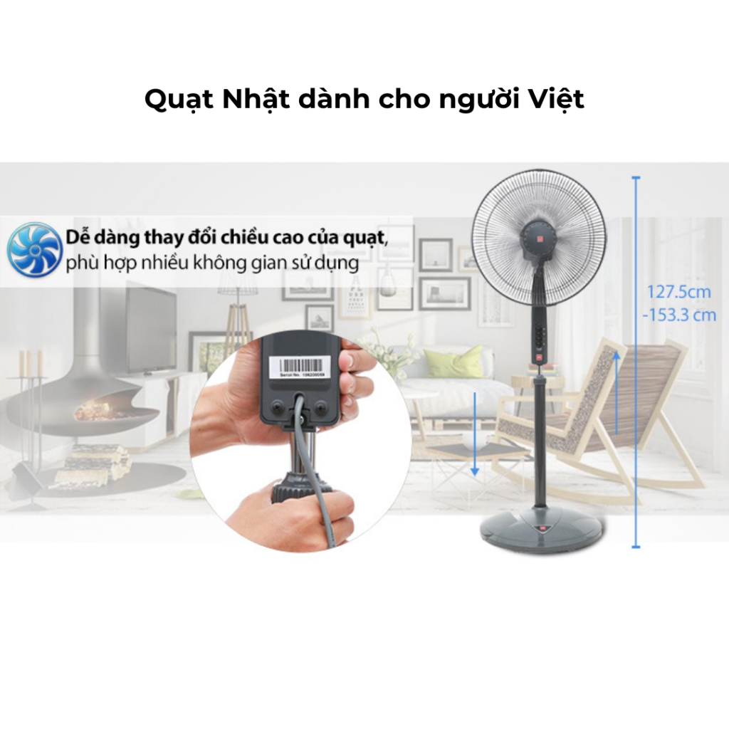 - Điều chỉnh linh hoạt: Chiều cao quạt điều chỉnh từ 129-154 cm, cho phép làm mát ở nhiều vị trí khác nhau, từ tầm thấp đến tầm cao.