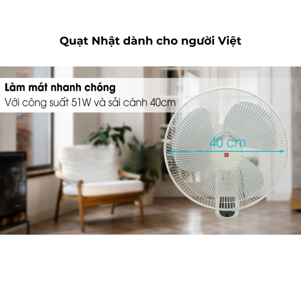 - Đường kính cánh quạt: 40 cm (3 cánh, nhựa trong suốt cao cấp, bền bỉ, dễ vệ sinh)